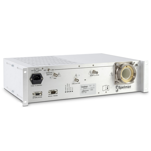This unit provides a highly regulated, low noise, ultra stable Accelerator supply programmable up to -30kV at 400uA. This, together with Floating Filament and Grid supplies referenced to the Accelerator control the beam. The unit also includes high voltage outputs to drive the Detector, comprising PMT, Scintillator and Collector grounded outputs.